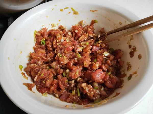 3.取一塊豬肉,喜歡吃香一點的最好用五花肉,切碎剁成肉餡後放入盆中,然後再加入適量的蔥花和薑末攪拌均勻,接著倒入生抽、味極鮮、蠔油、胡椒粉、香油、花椒油,將肉餡攪拌粘稠後醃制半個小時左右,讓肉餡充分地入味。