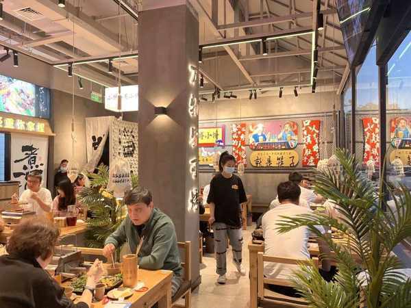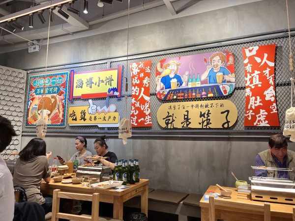 首先是門頭和店內環境,和淄博當地隻見人頭的露天夜市不同,上海首傢淄博燒烤采用瞭時下流行的新中式風格裝修。大廳明亮,空間開闊,墻上貼滿瞭年輕人喜愛的網紅標語,讓人有拍照的沖動。