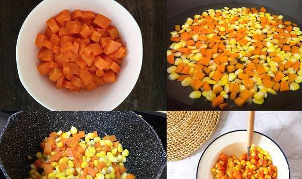 制作過程:1、我們先將胡蘿卜削皮,洗凈後切成細丁;再把玉米剝粒;2、起鍋燒水,水煮沸後,將胡蘿卜和玉米粒下鍋煮一下,煮熟後再撈起來瀝幹水分;3、起鍋燒油,蒜泥煸香一下,再將胡蘿卜和玉米一起下鍋,大火快炒出鍋,加點鹽提味。