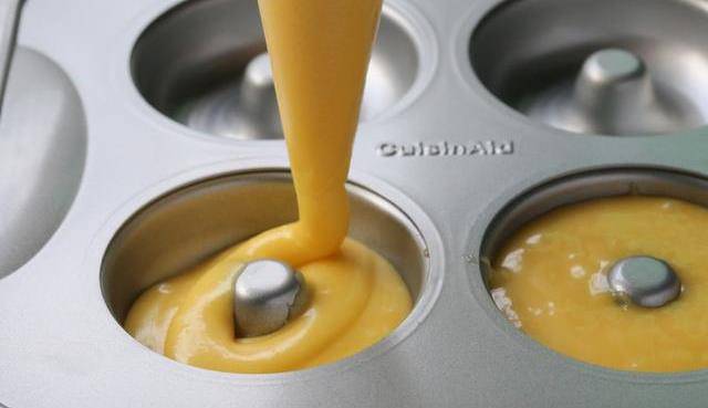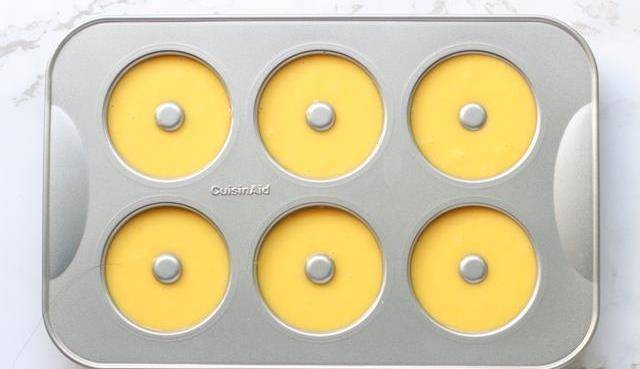 『小貼士』面糊擠入模具是七分滿,面糊太多,做出來甜甜圈會很胖,中間的孔會消失。配方的量差不多可以做六個的量,模具的單杯直徑為7.3厘米,僅供參考。