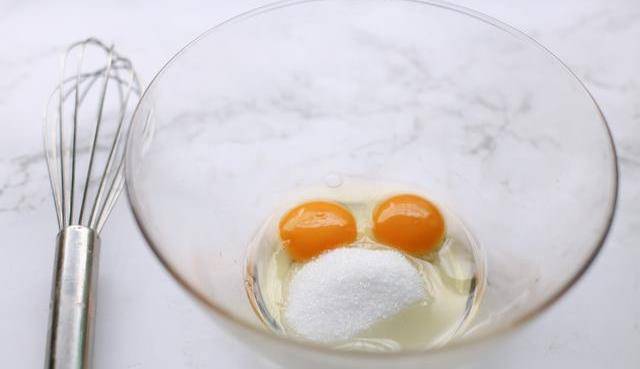 1、將兩個雞蛋打入容器中,加入60克細砂糖攪打均勻。