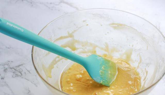 4、面糊中加入60克玉米油,攪拌至玉米油充分融入面糊中,面糊呈順滑狀態。
