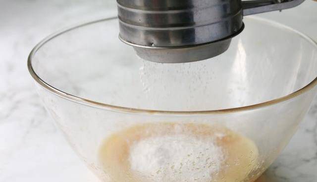 3、100克低筋面粉、2克泡打粉混合後篩入蛋液中,加入2克鹽,攪拌至無幹粉無顆粒狀。