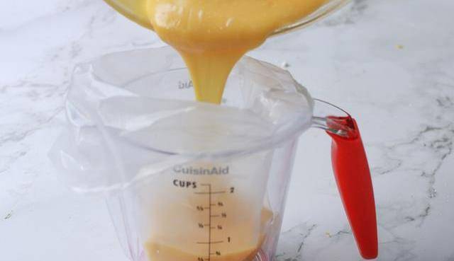 5、將裱花袋套在量杯上,然後裝面糊倒入裱花袋中。