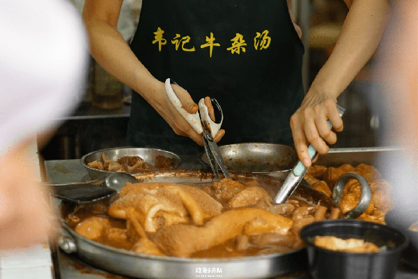 韋記是很多人去順德必吃的街頭檔之一,開瞭8年瞭,經常要排隊。他傢的牛雜偏咸口,三十元一大碗,牛雜吃起來沒有膻味,吃起來很入味,配一點辣椒醬是點睛之筆。店裡還有牛雜粉牛腩面,當做正餐吃也可以。