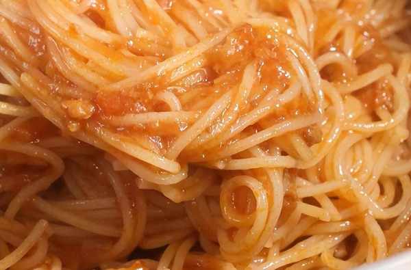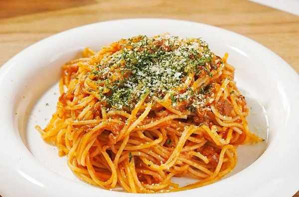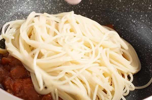 2、另起鍋,倒入醬料和煮好的意面。小芽的肉醬減鹽處理,滿滿的牛肉番茄,配料看得見。