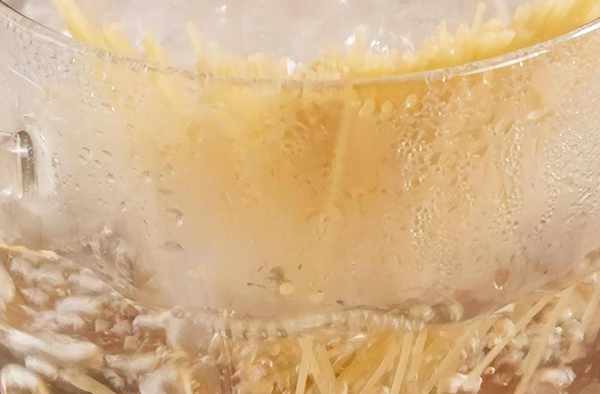 1、鍋中水開下意面煮熟。小芽的意面長度更短纖維更細,方便寶寶咀嚼吞咽,5分鐘左右即可煮熟啦!