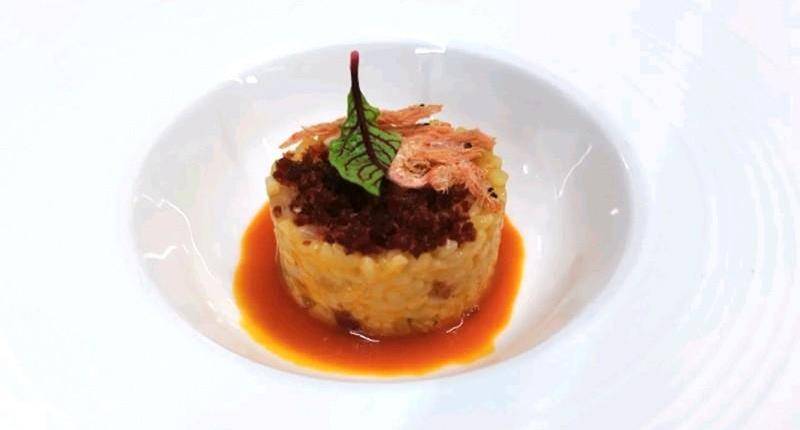 米飯用慕斯圈裝盤,最後擺上櫻花蝦,淋入番茄龍蝦湯即可
