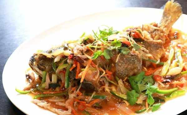 鍋留底油,放入洋蔥、蔥段、辣椒末爆香,放入胡蘿卜絲、筍絲、酸菜絲、香菇絲翻炒均勻,加入用糖、烏醋、水、豉油、香油調成的糖醋醬燒開,用水淀粉勾芡,最後淋上香油