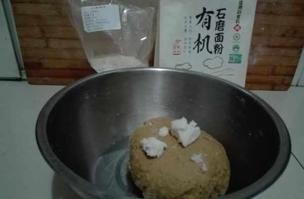 5、將豬油同面團一起繼續揉成一個光滑的面團,蓋好保鮮膜後進行室溫發酵。