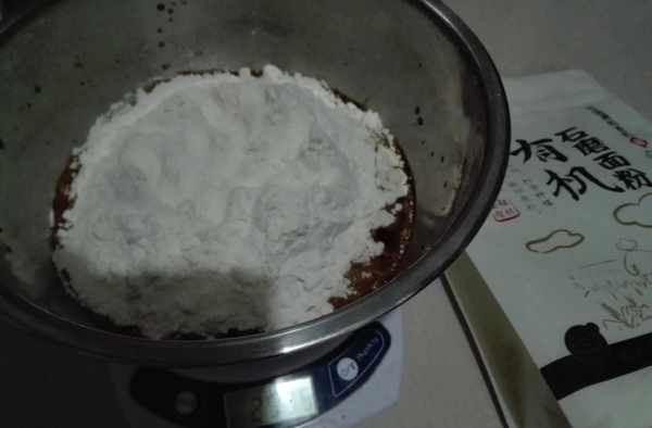 2、放涼後的紅糖水中倒入酵母稍做融化,然後將面粉同時倒入,如圖所示。