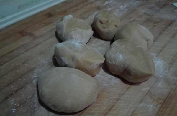 7、在案板上撒上適量的幹面粉,將發酵好的面團取出在案板上先將發酵時所產生的氣體全部揉出去,然後將其等分成自己喜歡大小的劑子,如圖所示。