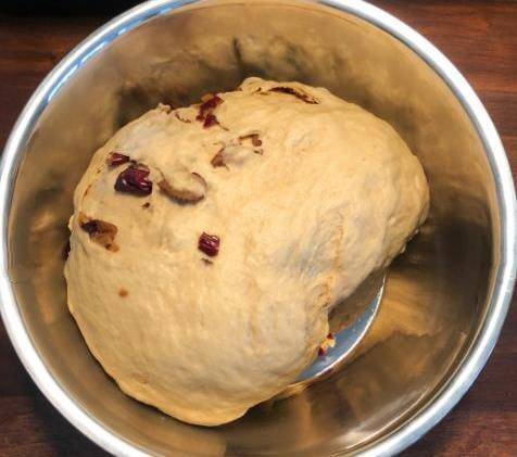 紅棗去核之後,剁成三瓣,我喜歡吃那種大顆粒的紅棗,如果喜歡碎一點的可以放入料理機中打成碎末,直接加入到面粉當中也是可以的。攪勻的酵母紅糖水倒入面粉中,紅棗顆粒也放進去,下手和成不沾手,沒有幹面粉的面團。