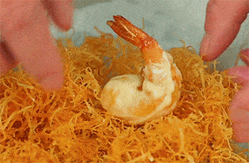 14、裹好沙拉醬的蝦表面在裹上厚厚的一層土豆絲,裹好後裝盤即可。