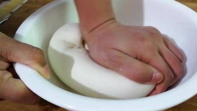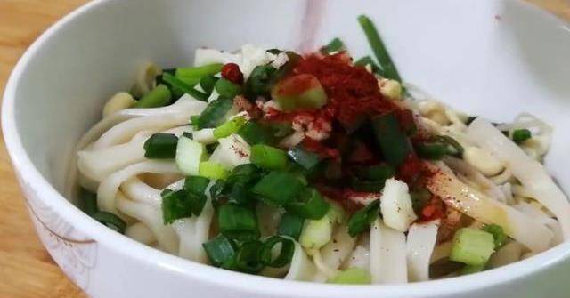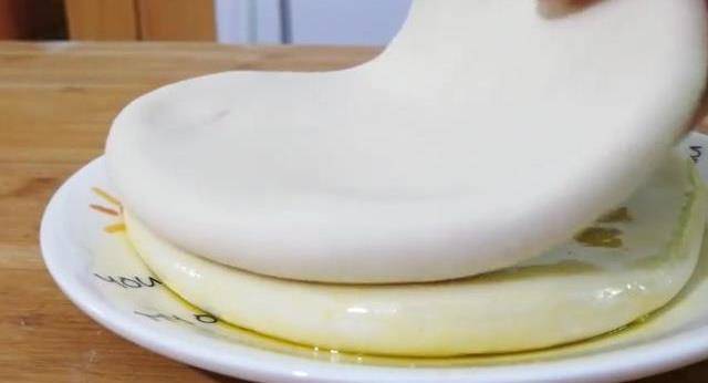 用搟面杖搟成一厘米厚。把搟好的餅放入盤子中,抹上油,周圍都要抹上,然後蓋上保鮮膜,醒面大概兩個小時左右。兩小時後面就行,把網線給我拿下來,用搟面杖搟成長條,像這樣切成一塊一塊,面條就吃好瞭,這樣做非常的方便。
