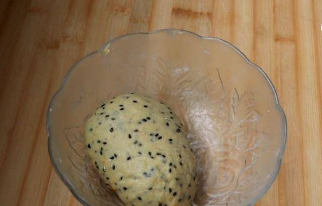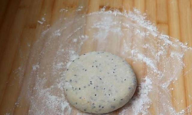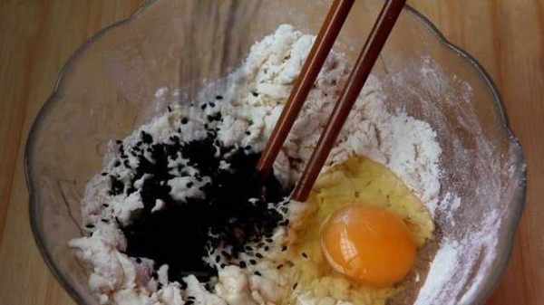 5.接著打入一個雞蛋,放一把黑芝麻攪拌均勻後,下手揉成表面均勻的面團。
