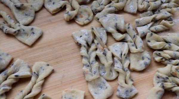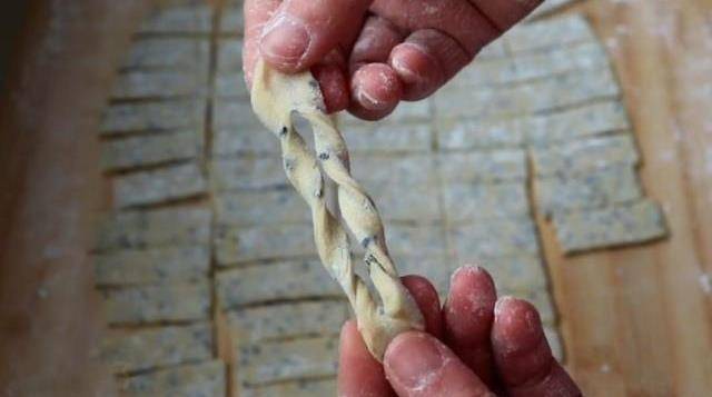 9.將面片切成拇指粗細的均勻面片,然後將面片中間劃一刀,再將兩邊往中間卷兩下。