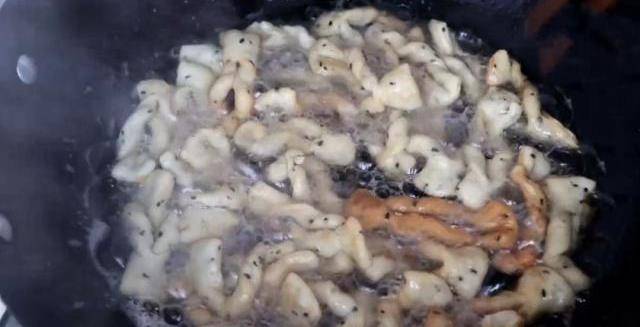 11.鍋中倒入多一點的食用油,油溫燒至7成熱後將面胚下入鍋中進行油炸,炸至定型後用筷子翻動下讓其受熱均勻。