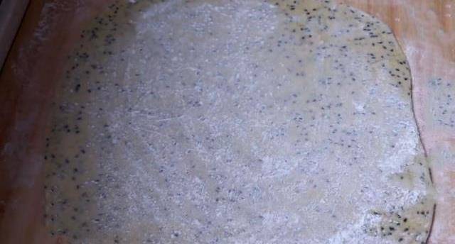 8.用搟面杖將其搟成大的圓形薄片,盡量搟薄一些,上面再抹上一些幹面粉防止粘連。