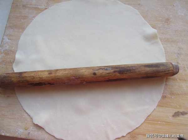 第二步:燙好的面涼一會兒,揉成面團,靜置醒一會兒,在揉勻,揪成大小一致的小面劑子,用搟面杖搟成薄薄的面皮。