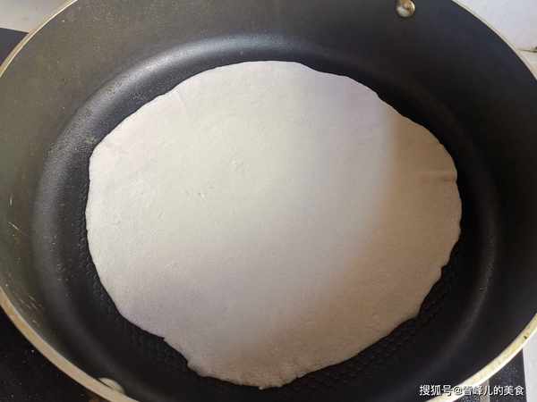 第三步:平底鍋燒熱,改成小火,把面皮放入鍋裡,小火慢慢烙制。