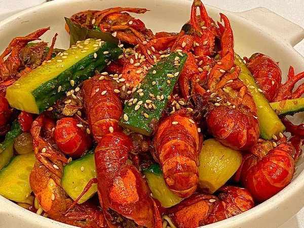 做法:1、小龍蝦處理,去蝦線去鰓,去掉尖尖頭;黃瓜切條、洋蔥切絲;