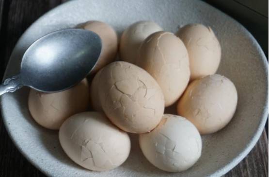 做法步驟:雞蛋先放清水中清洗外殼,在冷水煮蛋,煮五分鐘,關火再讓它悶兩三分鐘,取出,把雞蛋外殼敲出裂縫。