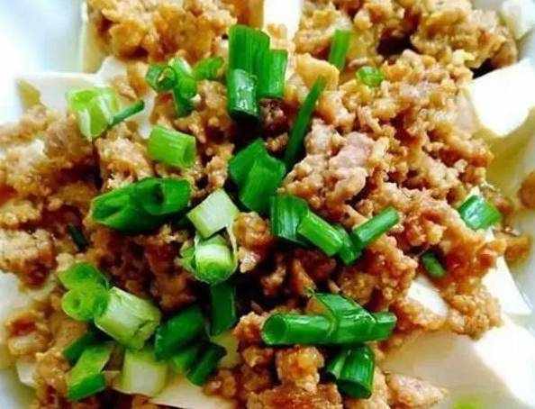 3.炒好的肉末連湯汁一起淋在豆腐盤裡,上鍋蒸10分鐘;出鍋,撒蔥花;