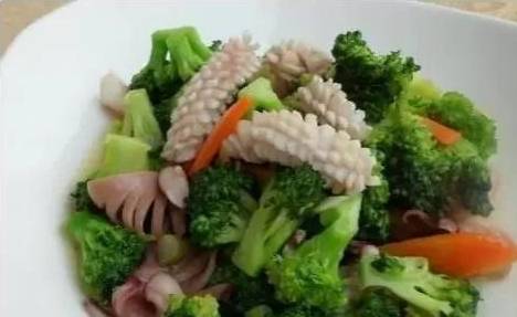 材料:魷魚200g西蘭花200g、郫縣豆瓣,鹽,料酒,薑,蒜