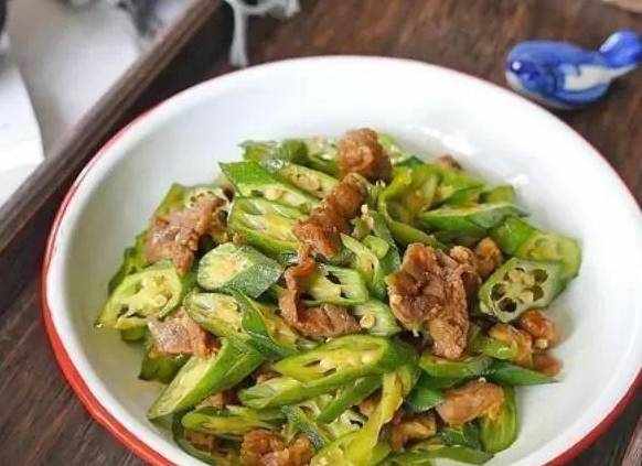 食材:梅花肉100克、秋葵200克、尖椒2個、生薑絲少許、鹽適量、生抽2茶匙、老抽數滴、淀粉少許、白糖少許