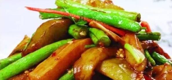 4、熱鍋涼油,倒入生薑絲炸一下,再倒入秋葵翻炒至變色。