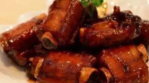 4、開蓋,放白糖若幹,可根據自己口味,再放鹽,小火收汁,裝盤即可.成品排骨紅亮,湯汁裹在排骨上,非常有食欲。