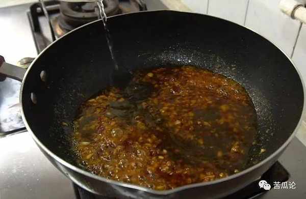 ③繼續在蒜末中,放一勺豆瓣醬調味,再放一碗水,煮沸蒜末汁水。