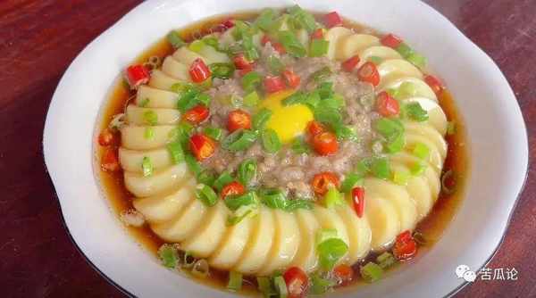 ⑤這道豆腐蒸肉,做法簡單,口感清淡,吃起來滑嫩又入味,而且易消化,很適合牙口不好的老年人和小孩子吃,用來拌飯更加下飯。