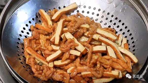 ③熱鍋放油,同時倒入香幹、瘦肉炒扁,放生抽、食鹽調味,炒熟撈起。