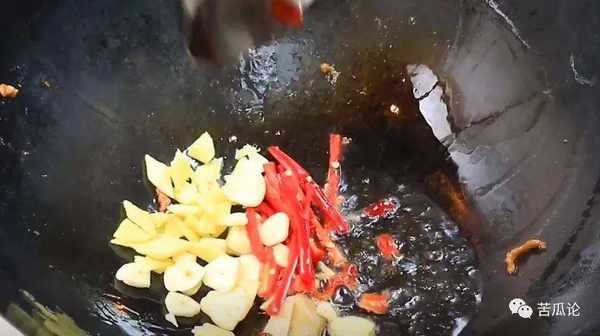 ④繼續熱鍋放油,小米椒、大蒜炒香。