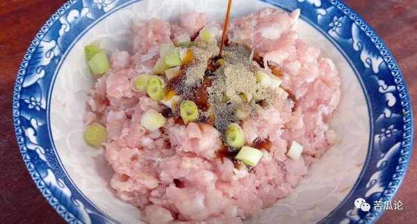 ②接著準備2塊錢瘦肉,剁碎成肉末放碗中,放食鹽、生抽、蠔油、蔥花醃制入味。