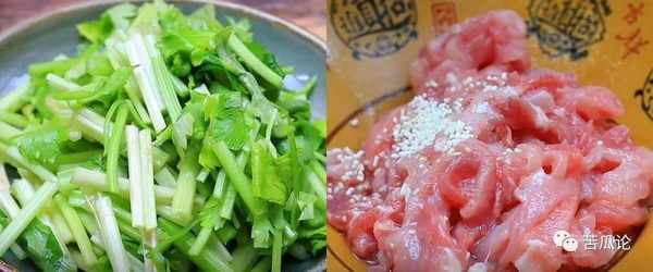 ②接著準備一把芹菜,同樣切條狀備用。另外準備2塊錢瘦肉,放食鹽、味精、料酒醃制。