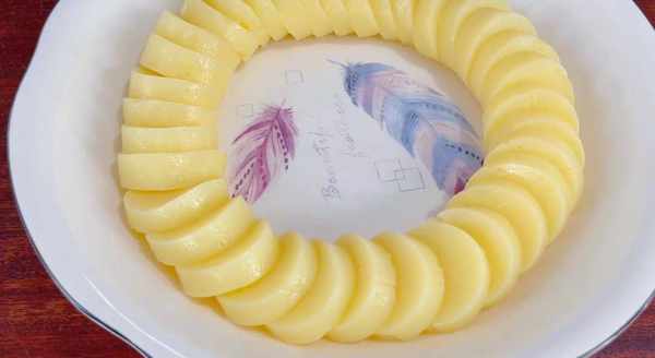 ①準備好條狀的豆腐,將它切成小段,每一段1厘米厚就可以。然後擺放在碟子上一圈。