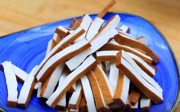 ①準備好香幹豆腐,切成條狀備用。