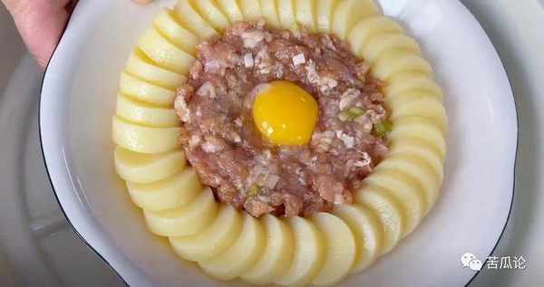 ③醃制好的肉末,放在豆腐中間,再中間打入一個雞蛋裝飾,就可以熱水上鍋蒸6分鐘。