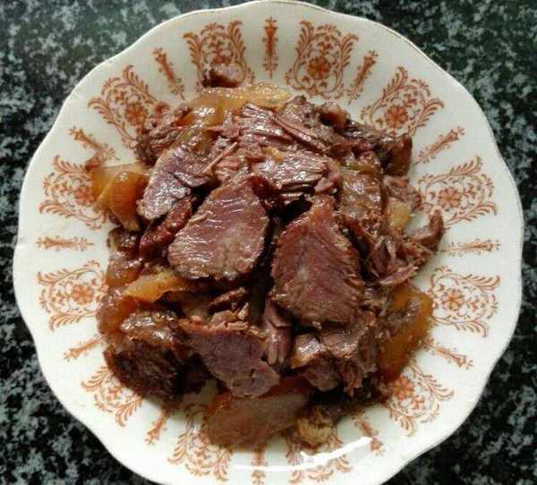 涼鍋涼油加冰糖,炒好糖色,下蔥薑炒香,加幹山楂,加花椒,桂皮,香葉,茴香倒入高湯,煮成湯汁,開大火下控好水的牛肉,開鍋後去沫,倒料酒,去沫,改小火加鹽燉二小時關火,撈出牛肉,放涼改刀切麻醬塊。