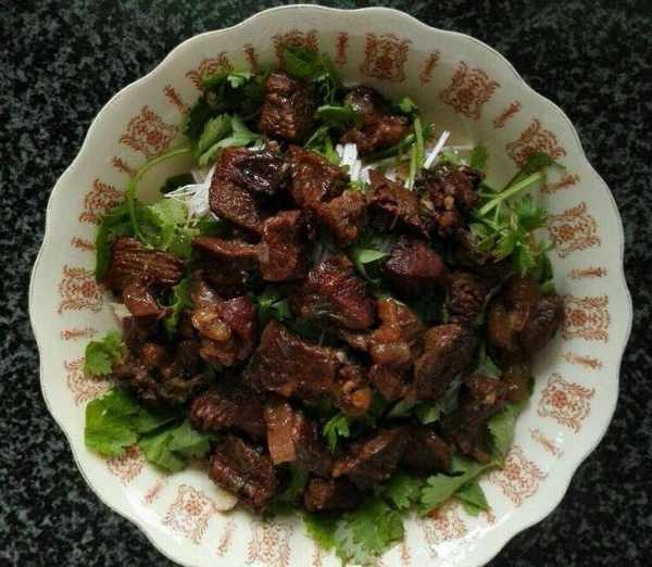 用開鍋煮好的鮮湯汁沖入碗中,然後倒出湯汁,上面放煮好的牛肉塊,再用鮮湯汁沖入。