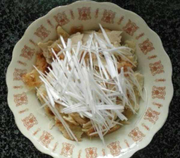 蔥白順切絲,用清水清洗控幹水,作用讓蔥精神挺直。