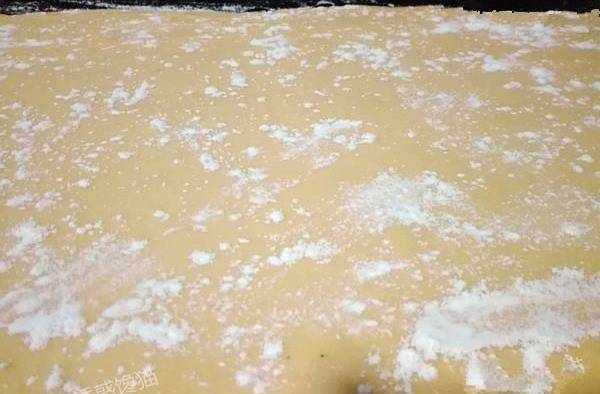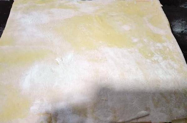 5.搟成長方形面片,刷一層油,撒些面粉,將面粉與油刷勻
