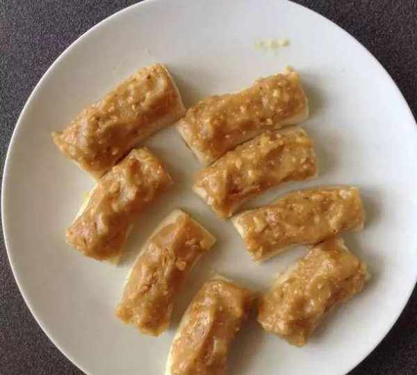 把冷凍好的香蕉塊拿出來,把上圖的花生糊澆至香蕉表面。