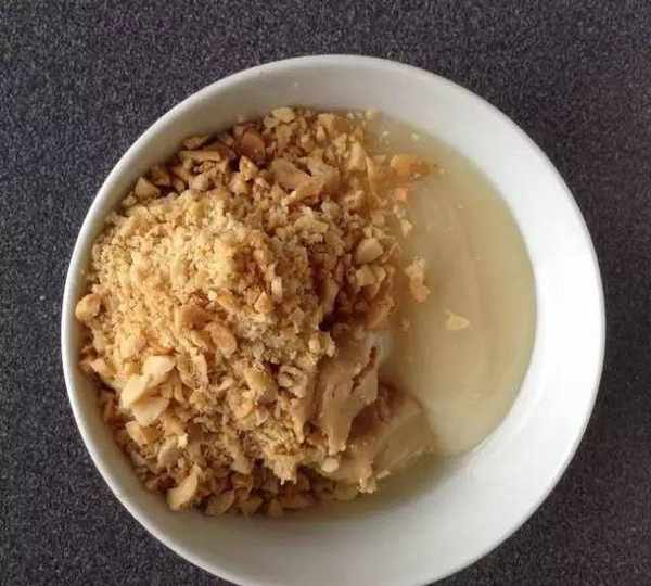 將兩湯匙的研磨咸口花生,三湯匙的花生醬以及兩湯匙的蜂蜜混合攪拌。