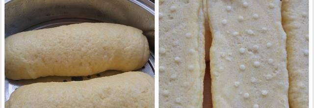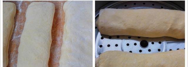 卷成如圖狀,蒸鍋加水,蒸格刷油,放入卷好的生坯,再二次餳發15分鐘上下;之所以做成這樣的大小和樣子,是考慮到傢中蒸鍋的尺寸特意設置的。如果機械地照搬其他人的做法,搟成一大張,這樣不易成熟,蒸的時間要延長,所以要隨機做一些改變。