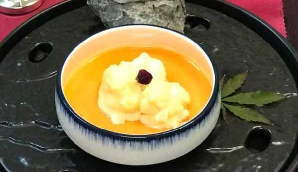 雞蛋清加入熬好的龍蝦湯、花雕酒、味精拌勻,放入蒸籠蒸8分鐘,做出芙蓉底。