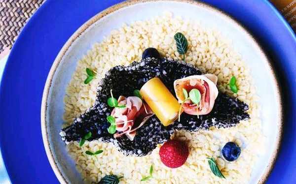 火腿50克、西米50克、藍莓、脆米1勺、樹莓1個、哈密瓜20克、豆苗、墨魚汁